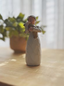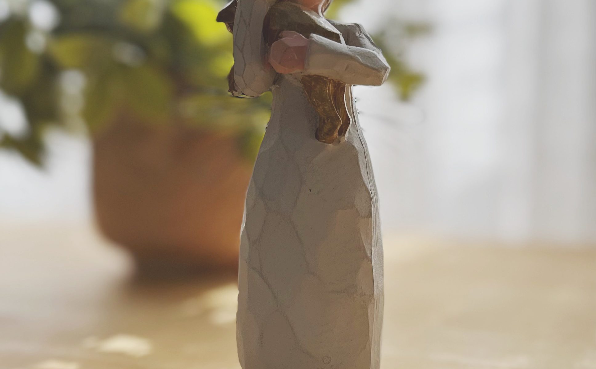 Angel with metal wings holding dog. (Shown in gallery pictures) This is a simple figurine that honors the spirit of loosing a loyal companion. Angel is made our of Molded Resin and hand painted. To clean just use a soft cloth to dust. Avoid harsh cleaning solvents.