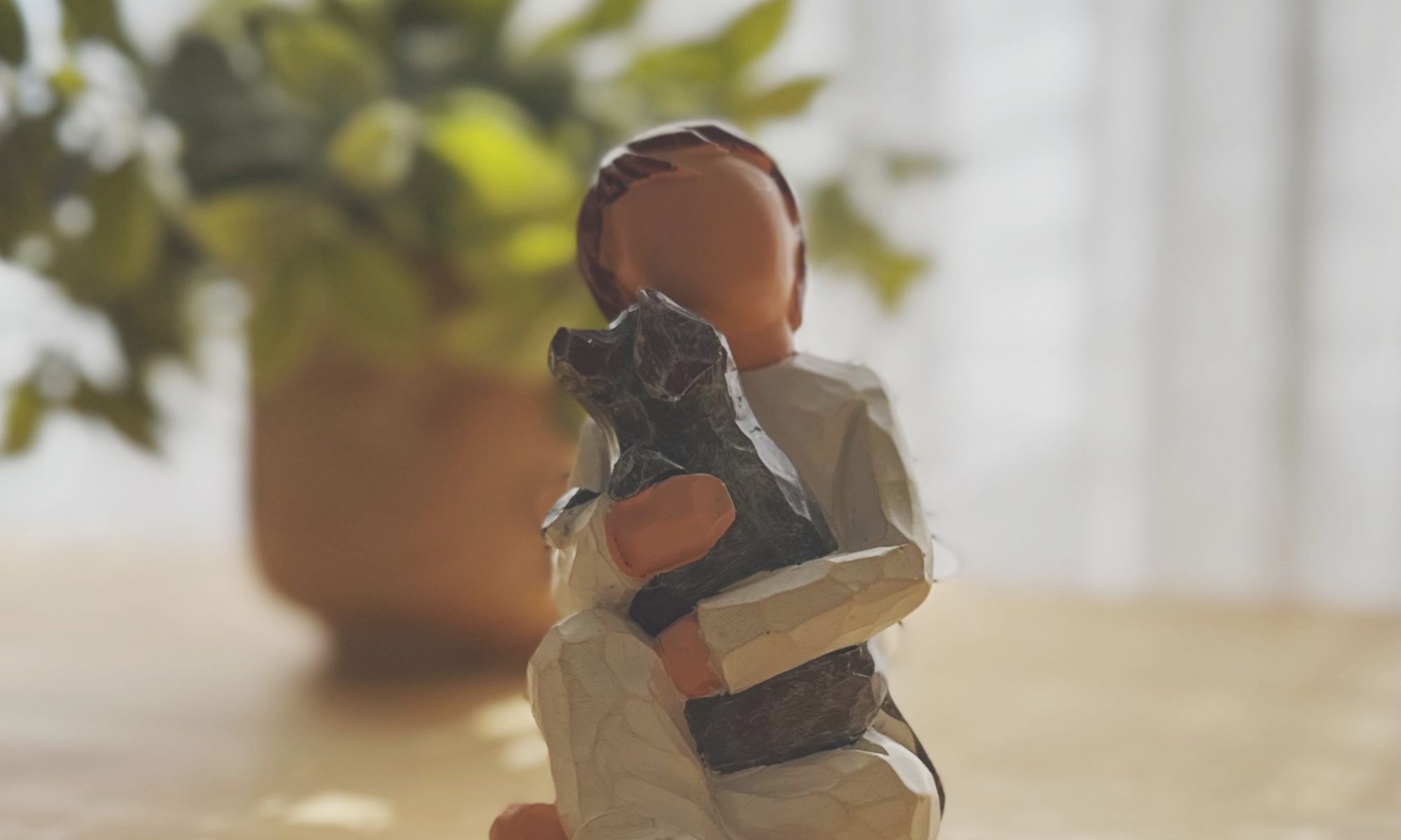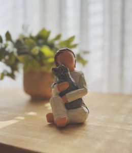 A boy angel with metal wings holding dog. ( Shown in gallery pictures) This is a simple figurine that honors the spirit of loosing a loyal companion. Angel is made our of Molded Resin and hand painted. To clean just use a soft cloth to dust. Avoid harsh cleaning solvents.
