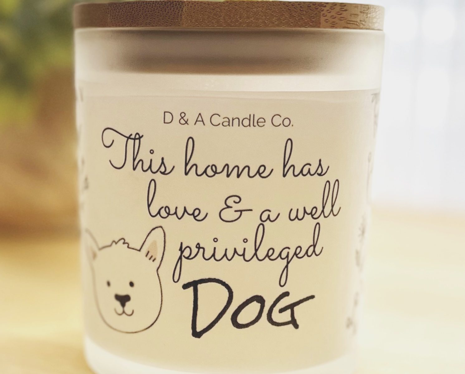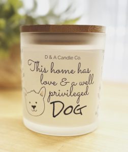 Hand poured blended soy wax in a heavy frosted glass jar now with wooden lids for a sophisticated design. The wax is creamy and finishes smooth after each burn. Powered by custom blends of prestigious fragrance oils. Smooth notes of coconut, fresh bamboo, eucalyptus, lemon grass and sweet pineapple. The aroma is clean and delightful. Each candle is hand crafted and has new translucent wraparound labels which illuminate the candle beautifully. Each candle is packaged in it’s own box making for a special gift to any dog lover to enjoy. FREE gift box matches included.
